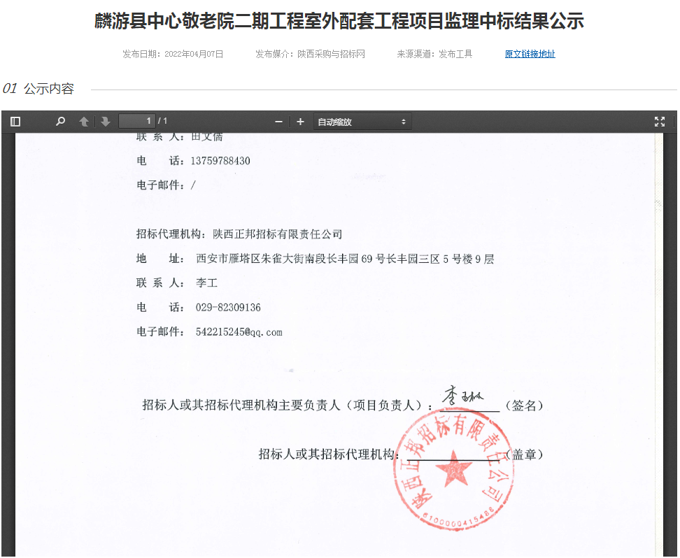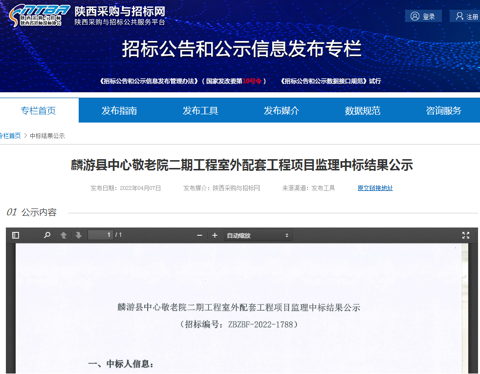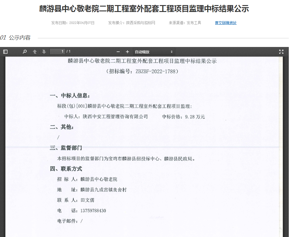 麟游縣中心敬老院二期工程室外配套工程項目監理中標結果公示