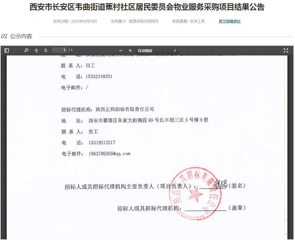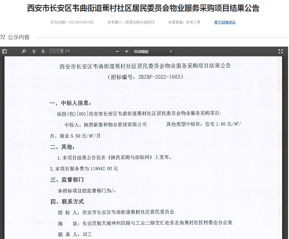 西安市長安區(qū)韋曲街道蕉村社區(qū)居民委員會物業(yè)服務采購項目結果公告