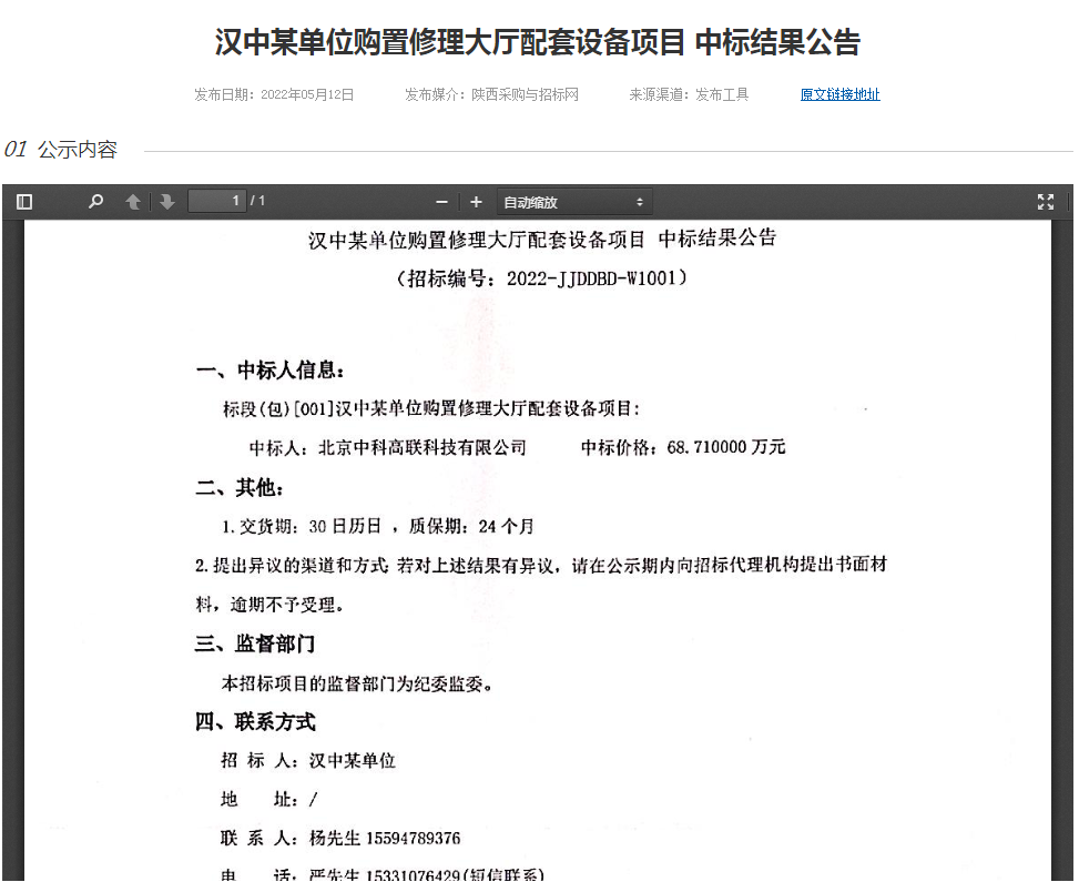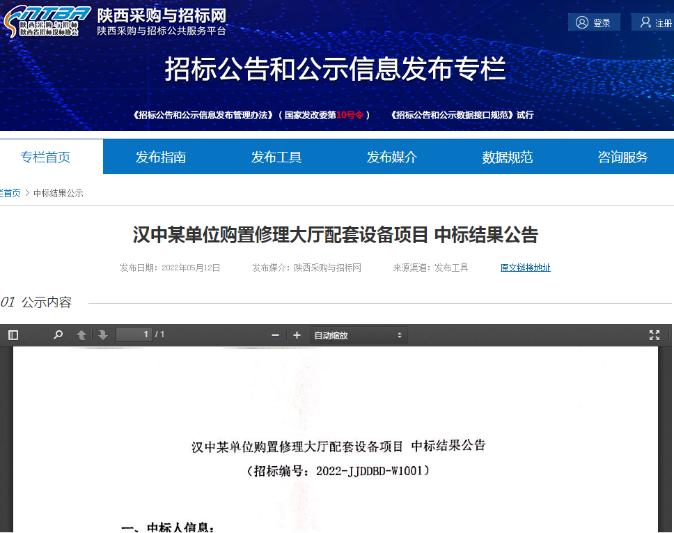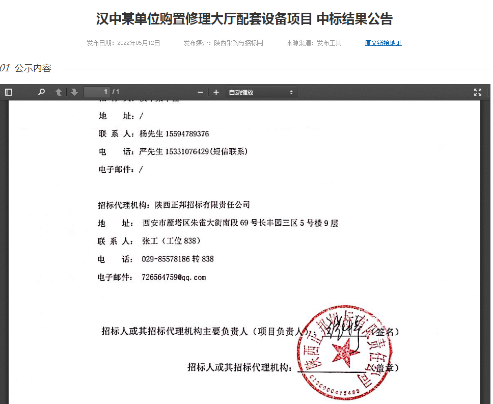 漢中某單位購置修理大廳配套設備項目 中標結果公告