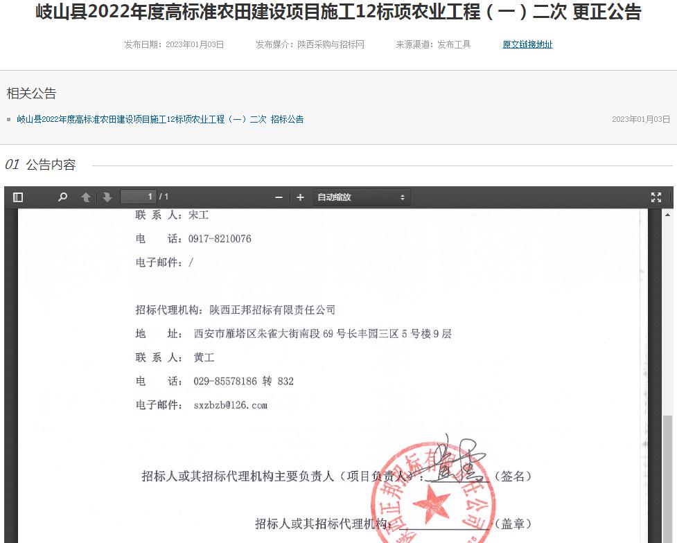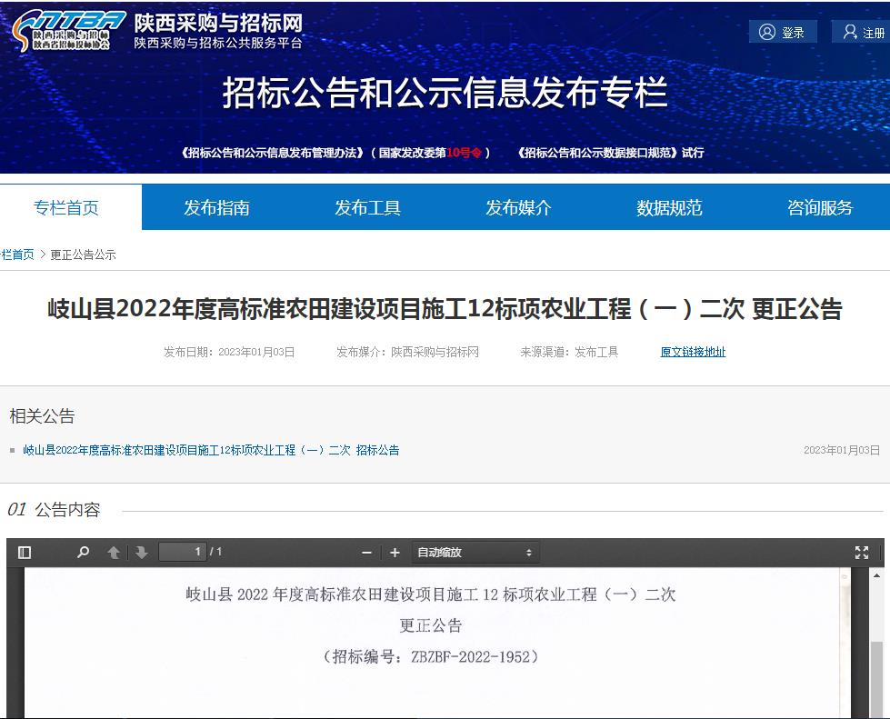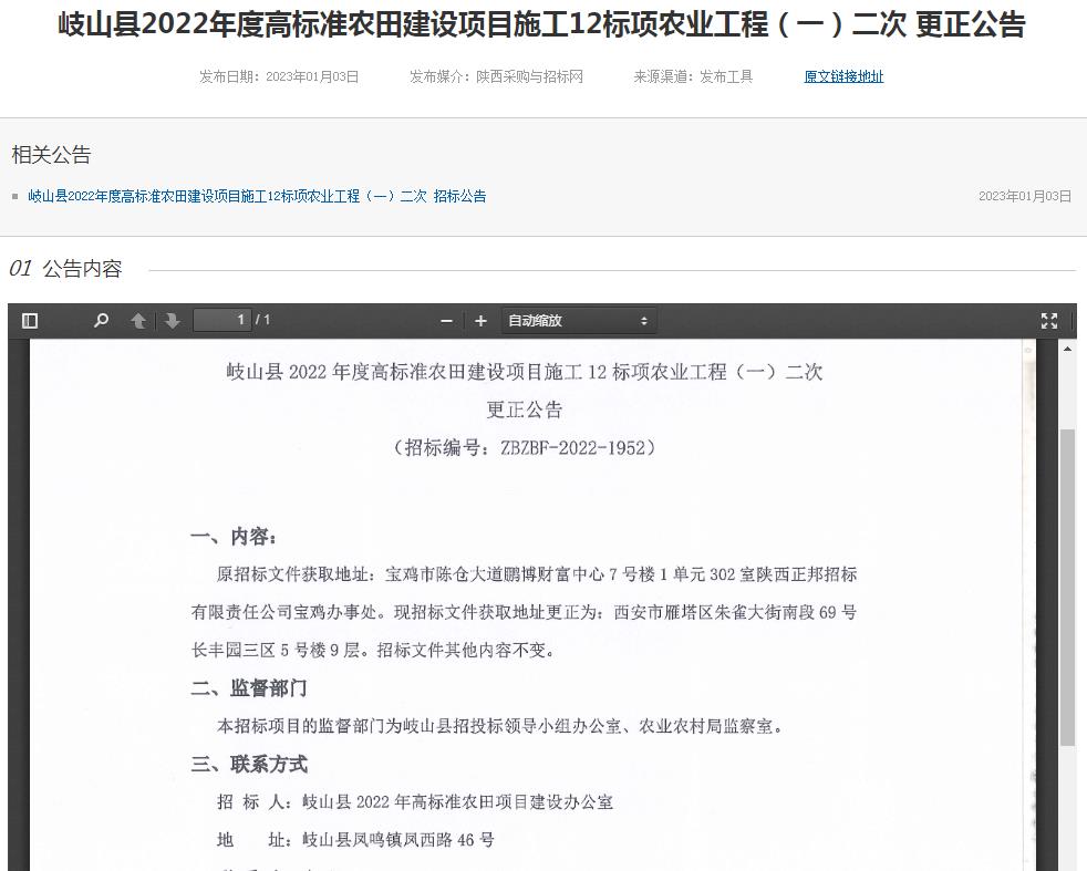 岐山縣2022年度高標準農田建設項目施工12標項農業工程(一)二次 更正公告
