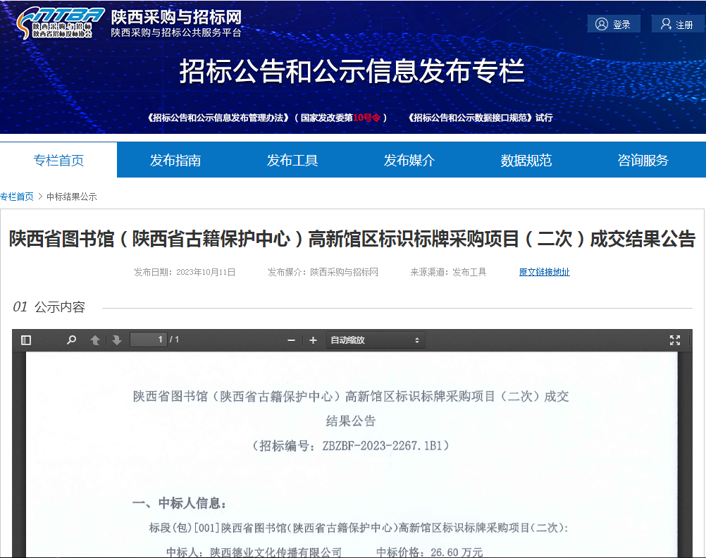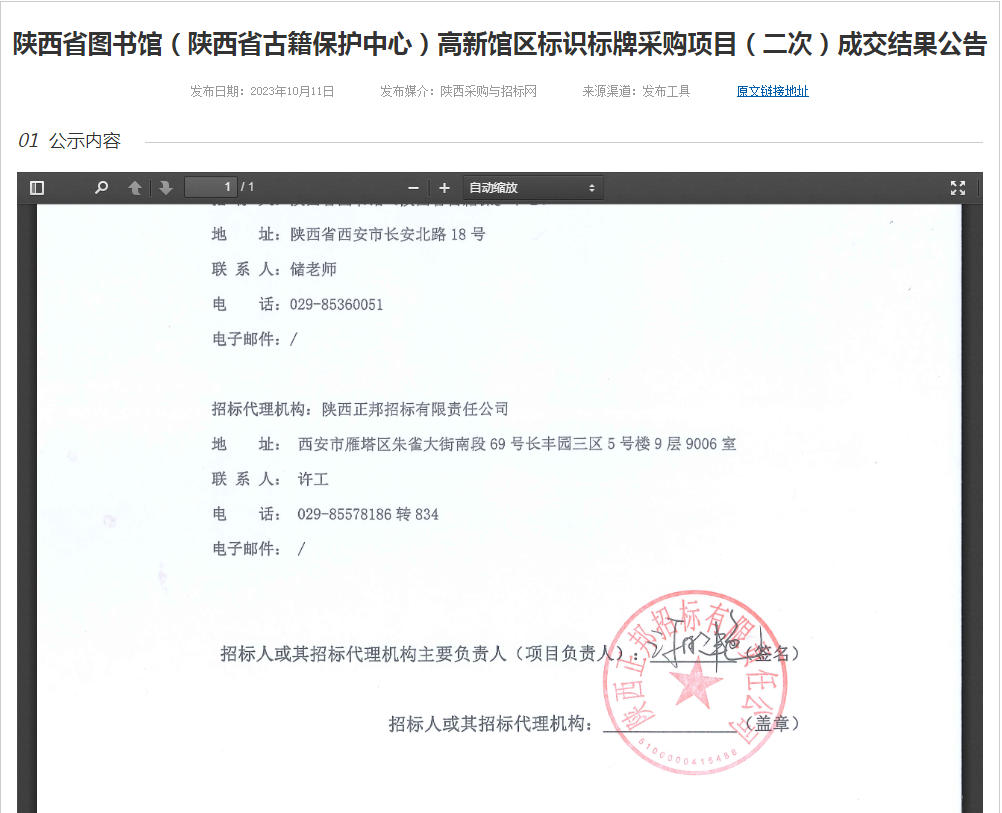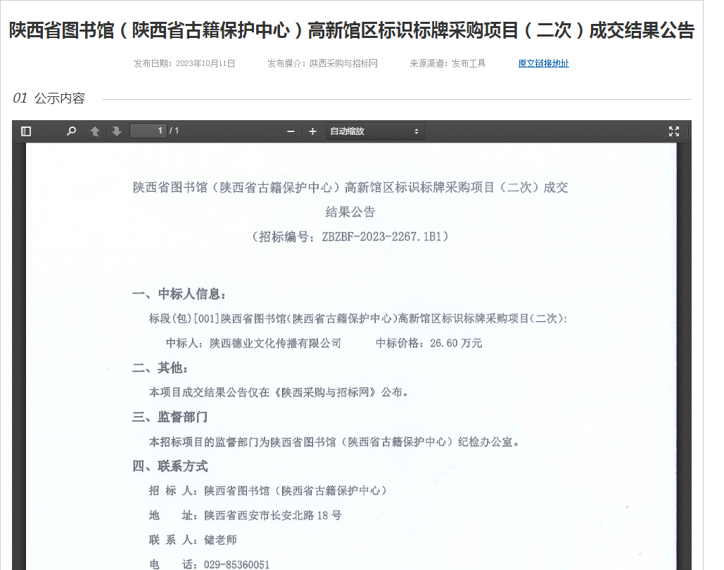 陜西省圖書館(陜西省古籍保護(hù)中心)高新館區(qū)標(biāo)識標(biāo)牌采購項目(二次)成交結(jié)果公告